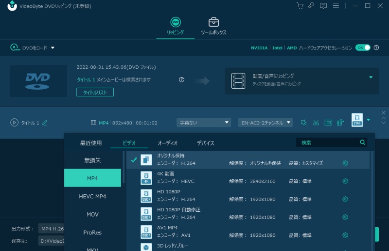 そのようなニーズに適しているのが、「VideoByte DVDリッピング」です。DVDディスクはもちろん、ISOファイルやDVDフォルダーにも対応しており、MP4などの一般的な動画形式へ高画質で変換できます。最新のコピーガードにも対応しているため、AnyDVDの代替として安心して利用できます。DVDをデジタル化することで、PCやスマートフォンでの視聴、バックアップ保存、動画編集など幅広い用途に活用可能です。